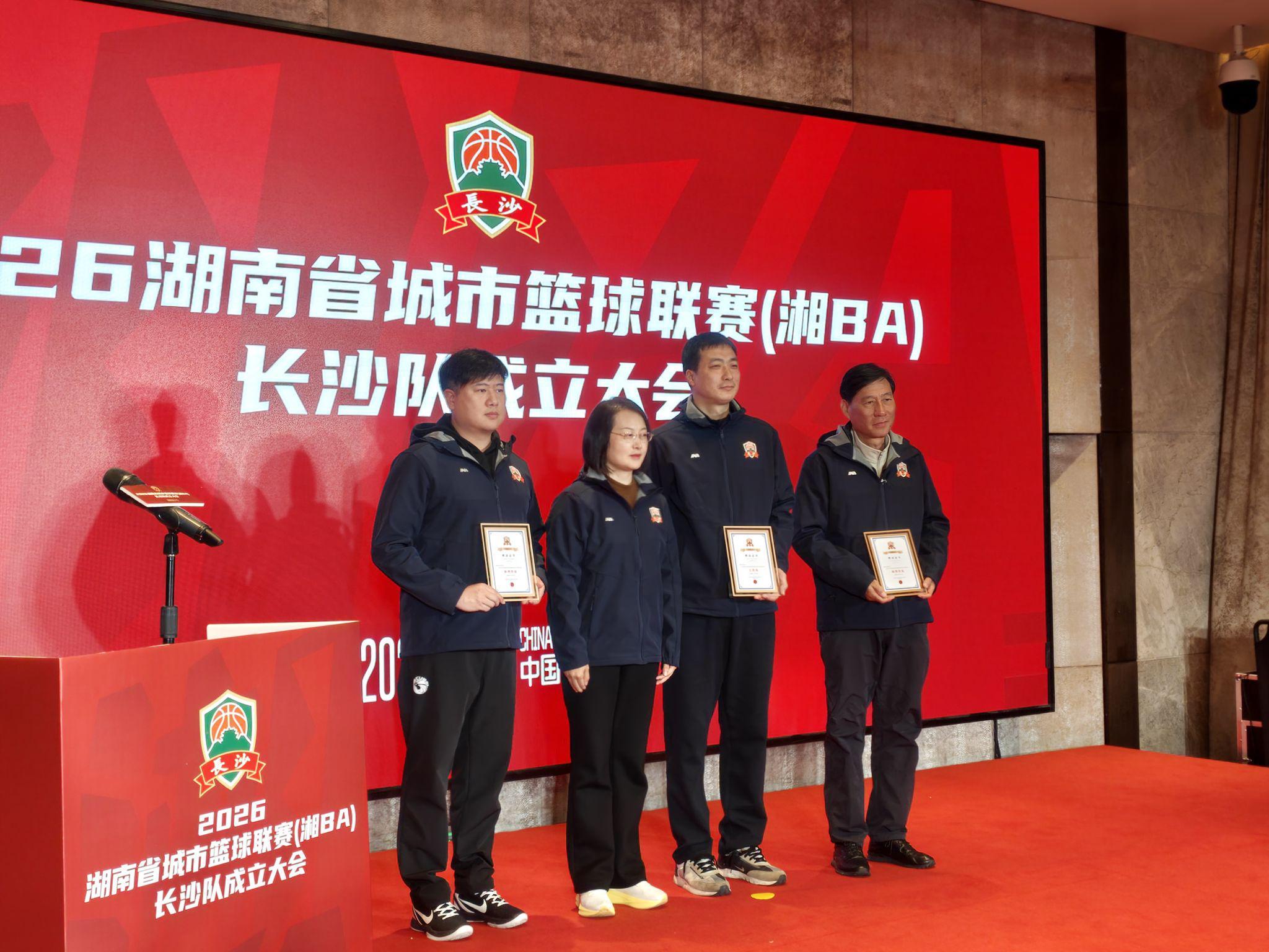 大会现场,长沙市人民政府副市长郑平为教练组颁发聘书,并向长沙队正式授旗,旗帜交接,使命在肩,标志着2026湘BA长沙队正式组建出征。